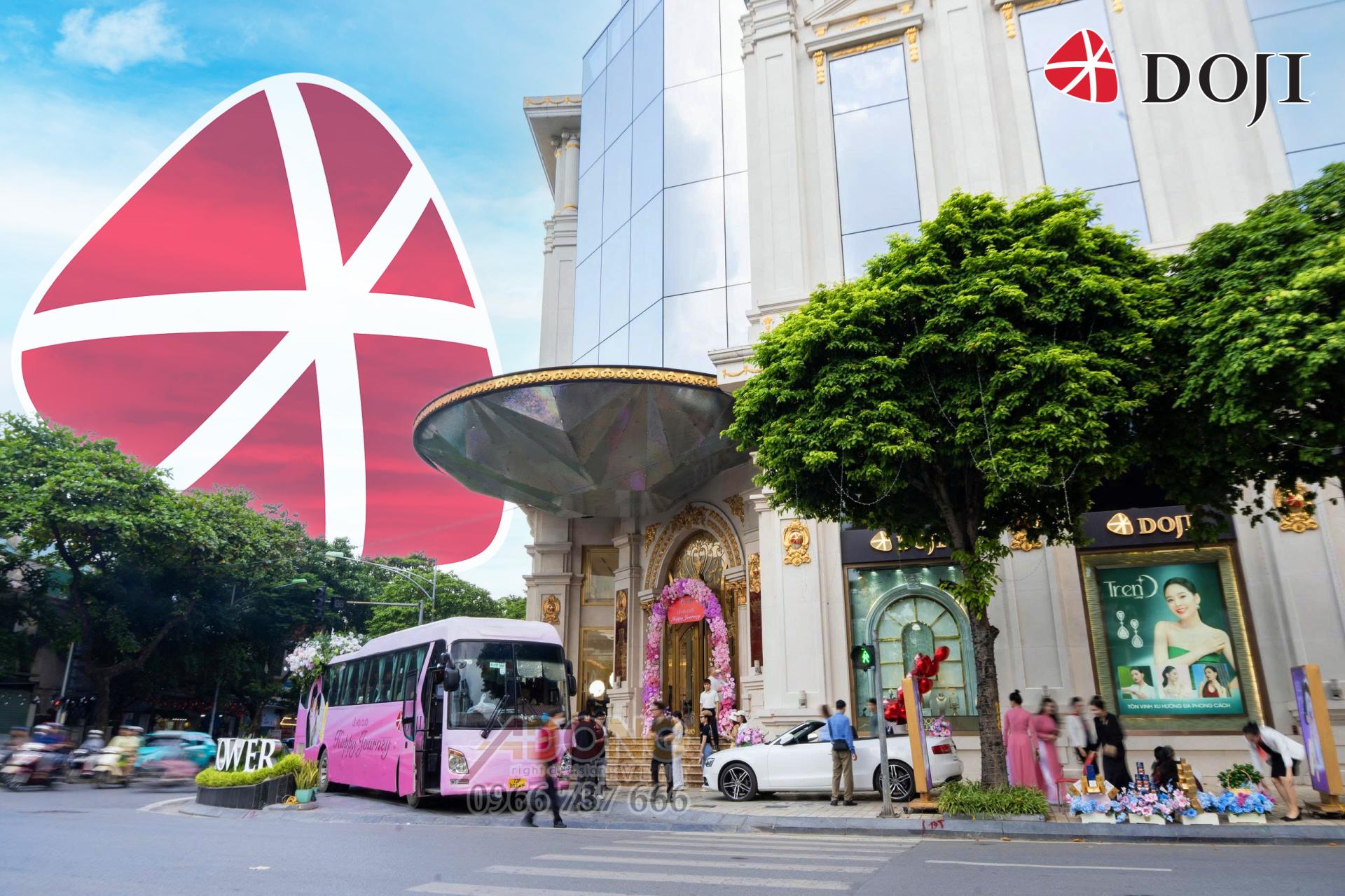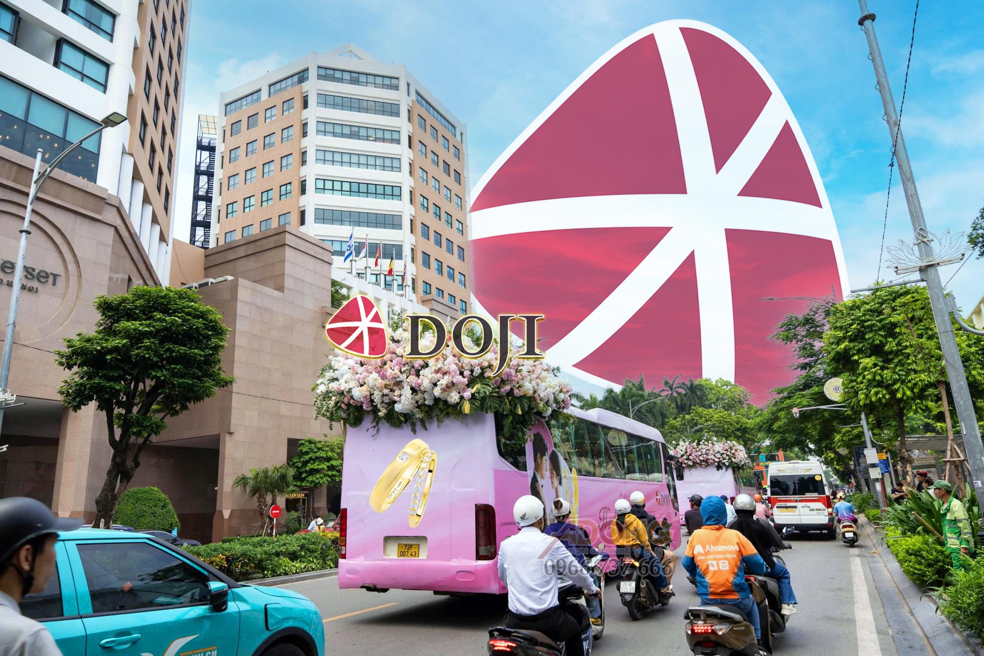Hai chiếc xe bus hoa DOJI được trang trí lộng lẫy, phủ kín hoa tươi và sắc vàng đặc trưng của thương hiệu DOJI, diễu hành qua các tuyến phố trung tâm, mang theo thông điệp về tình yêu – hạnh phúc – và giá trị vĩnh cửu. Hình ảnh đoàn xe hoa sang trọng, nổi bật giữa lòng thành phố, đã trở thành điểm nhấn thu hút hàng nghìn ánh nhìn và những lời chúc phúc nồng ấm từ người dân.
